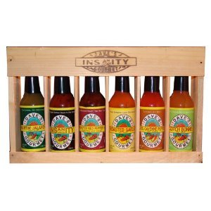 Dave's Gourmet Spicy Six Pack Crated Hot Sauce Collection w/ Insanity Sauce is A Great Gift Fun to Collect and Eat. Sauce Go From Mild to Beyond Wild. Work You Way Up To Insanity. A Wood Set of Flavor and Fire